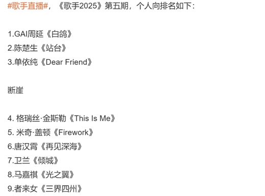 《歌手 2025》第五期的舞台就像一个充满惊喜和意外的大舞台,每一位歌手都有自己的故事和亮点。接下来的比赛肯定会更加精彩,让我们一起拭目以待吧!